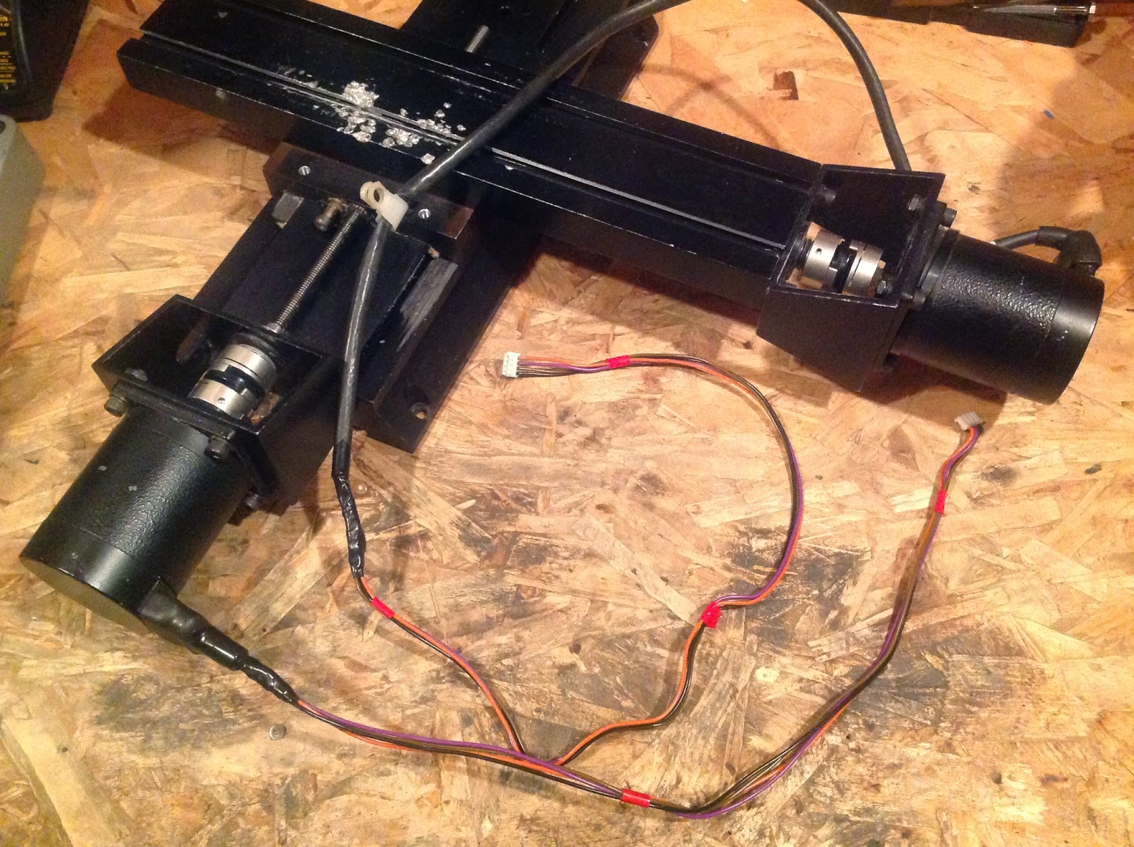 This is the barebones XY table from an old CNC machine with an outdated control system. Without the control system, it is useless, so my robotics team took a few apart and I walked out with this! It has two giant 4-wire stepper motors, threaded rod drive, and a very hefty construction. It weighs a lot, so it won't be tipping over any time soon! In tonnight's build session I stripped it of unnecessary junk and wiped off some accumulated grease.